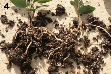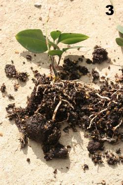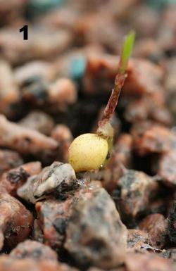 By this stage, the seedlings have developed one or more fairly thick fleshy white roots and a small crown with 2 or 3 stems. Such seedlings can be seen in pictures 3 and 4 | |