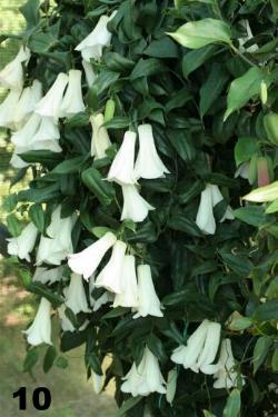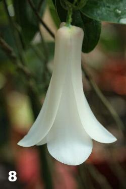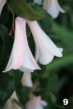 I am trying to develop two seed sown strains of Lapageria rosea. The basic one that has plenty of large deep rose flowers of good shape and form. I try to avoid flowers where the petals do not turn up at the ends. The second strain is described as “White/pale shades”. Half or more of the plants have pure white flowers and most of the remainder have some pale blush on the outer petals, often only towards the top. The inner petals of those plants often have brilliant white inner petals – brighter white than the pure white flowers. | |